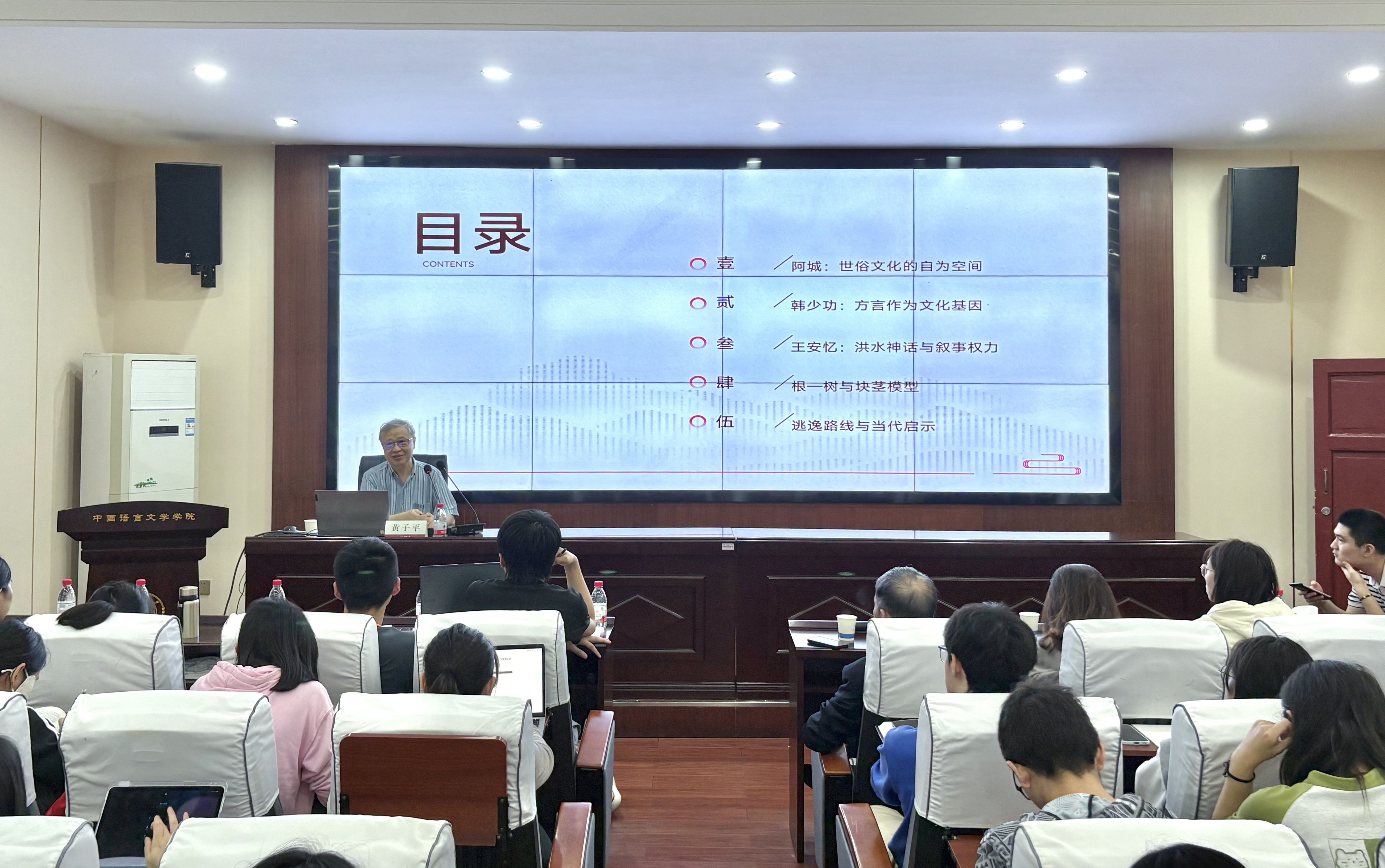 黄子平教授还指出韩少功在《爸爸爸》中通过鸡头寨的方言构建了一个独特的文化世界。这些方言词汇,保留了楚辞的遗响,成为文化基因的载体。并且近些年来,不少创作者使用方言写作,比如方言歌、方言小说等等。他表示,官方语言和村民语言之间存在着一定的角力。在《小鲍庄》的解读中,中官方语言和村民语言角力的结果是官方性语言更占上风。接着,黄教授以“坝与碑”的隐喻来解读《小鲍庄》,在他看来,寻根文学试图在语言洪流中建立记忆坐标。坝可以是阻挡官方叙事冲刷的方言土堤,碑则是官方正统的权威叙事。通过这种方式,文学成为抵御语言陈词滥调洪水的标记。